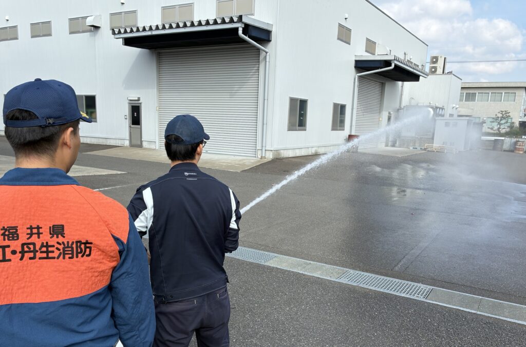 避難訓練では、社員全員が速やかに避難場所に移動ができており、消火器・放水訓練では、消防署の方